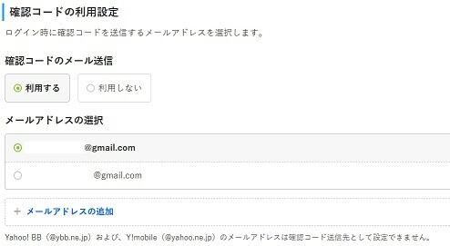 yahoo! BB(@ybb.ne.jp)および、Y!mobile(@yahoo.ne.jp)のメールアドレスは確認コード送信先として設定できません。