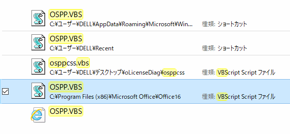 コマンドプロンプトを使う Officeの種類とそのプロダクトキーの下5桁が表示される @「ospp.vbs」ファイルの場所を特定する 1.エクスプローラーを開きます 2.C ドライブを選択 3.検索ボックスに ospp.vbs を入力し 検索 ![]() Aコマンドcmd 実行 cscript “C:\Program Files\Microsoft Office\Office16\ospp.vbs” /dstatus ↑実際にファイルのあった場所 ※直接エクスプローラーを地道に探っていっても出てきます C:\Program Files (x86)\Microsoft Office\Office16 ↑僕のはここにありました ![]()