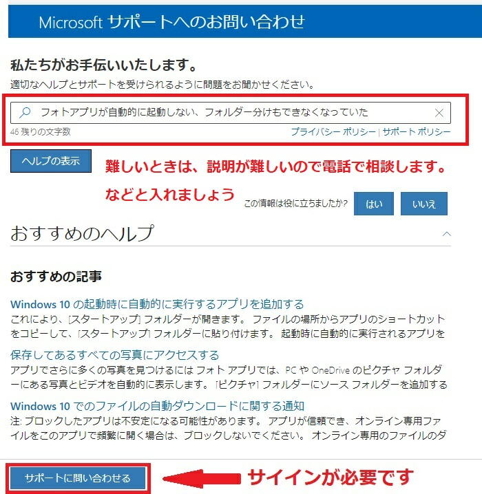 ルバック 2022/02/01に実際に試したものです マイクロソフトの問い合わせアプリを起動します (公式サイトのヘルプからも可能です) ・Microsoftアカウントでのサイインが必要です ![]() 質問内容を入力します
